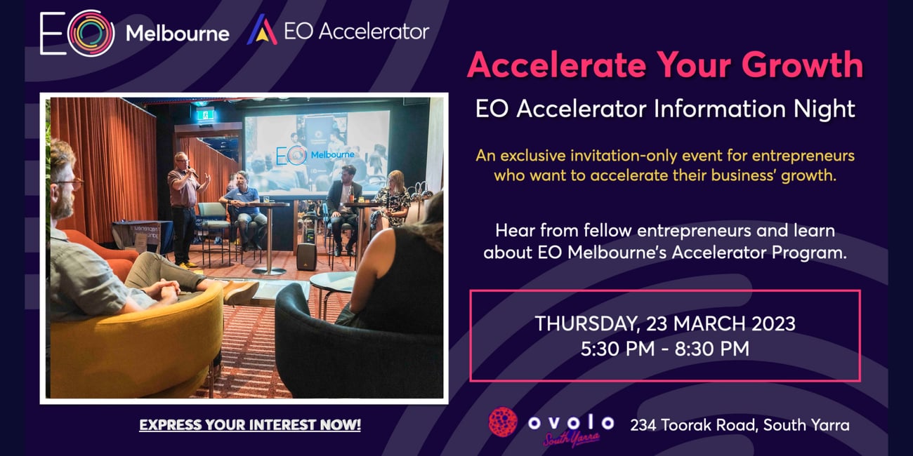 On Thursday, 23 March 2023, EO Melbourne is hosting a special event "ACCELERATE YOUR GROWTH" at the Ovolo Hotel in South Yarra, with drinks and canapes provided.